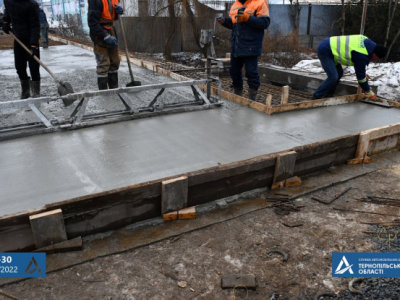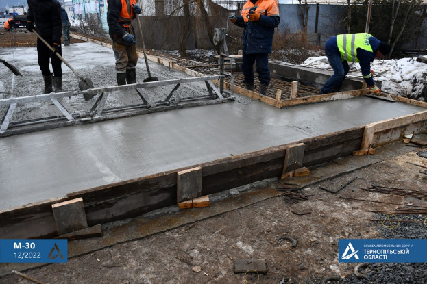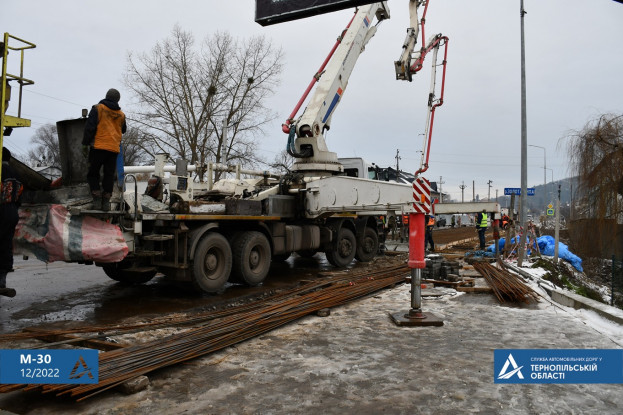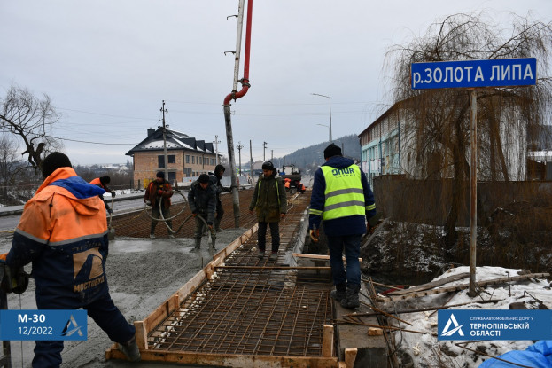 На 36-метровому мосту через річку Золота Липа забетоновано правий проїзд монолітної прогонової будови та тротуар на лівому проїзді. Раніше тут замінили балки та зав’язали арматуру.