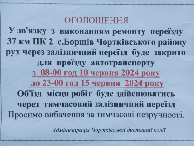 У зв’язку з виконанням ремонту переїзду в межах населеного пункту м. Борщів, який знаходиться км 123+720 Т20-02 Тернопіль-Скалат-Жванець рух через залізничний переїзд буде закрито для проїзду автотранспорту з 08:00 год. 10 червня до 23:00 год. 15 червня 2024 року.