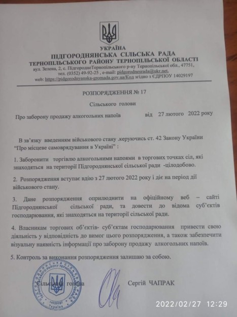 Розпорядженням голови Підгороднянської об’єднаної громади Сергія Чапрака в зв’язку з введенням на території Тернопільської області воєнного стану з 27 лютого заборонено торгівлю алкогольними напоями в торгових точках, що працюють у селах громади.
