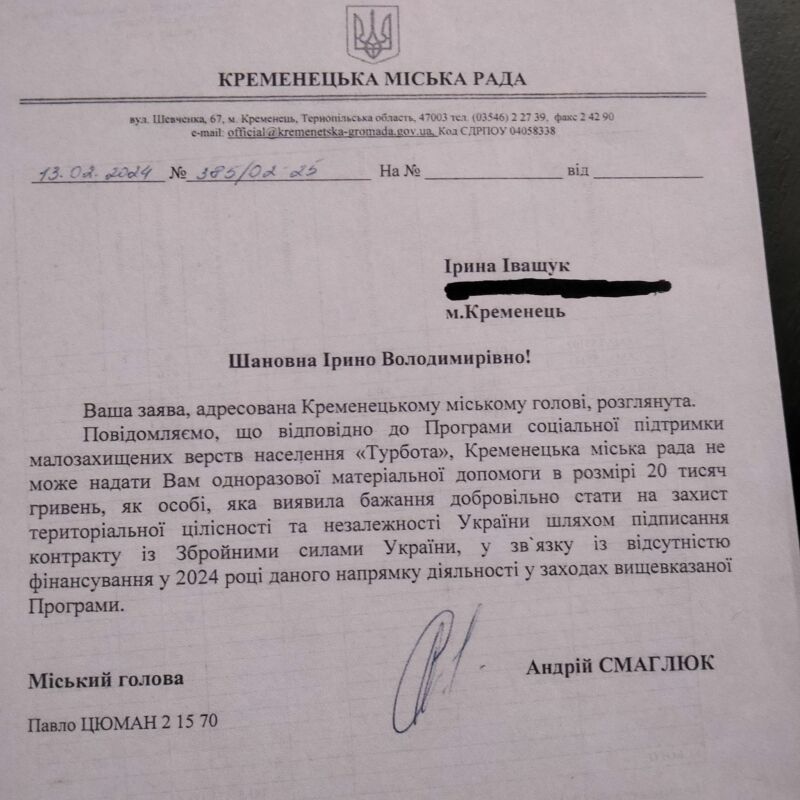 У міській раді розповіли, що на початку повномасштабного вторгнення до програми “Турбота” внесли зміни й згідно з ними контрактникам допомоги більше не виплачують. В офіційній відповіді Ірині Іващук пояснили, що виплата допомоги неможлива “у зв’язку з відсутністю фінансування у 2024 році даного напрямку діяльності у заходах вищевказаної Програми”.