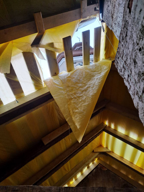 – Попри стурбованість керівництва ДІАЗу в м.Бережани (акт про протікання складено ще 19 січня 2024 р. та не повернуто з підписом і досі), попри глибоку стурбованість міського голови Бережан (оглянув місце події 22 січня), у Бережанському краєзнавчому музеї знову тече… На світлинах – причина (кілька квадратних метрів даху відкриті) та наслідки (пошкоджено стелю у виставковій залі, затікання на стінах, «здутий» паркет…). Можна багато говорити про відновлення України!.. А можна просто нищити те, що є, – бідкається Микола Проців.