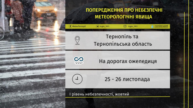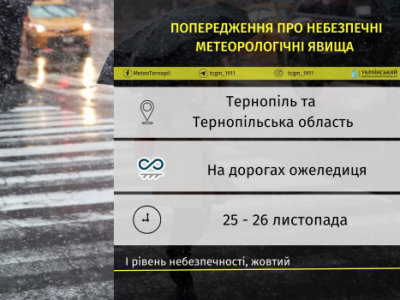 У зв’язку з виходом Балканського циклону та переміщення його через територію України в Тернопільській області та м. Тернопіль 26-27 листопада 2023 року очікується погіршення погодних умов.