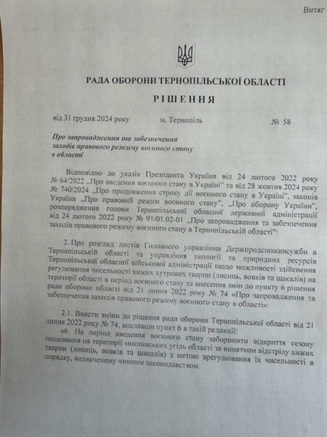 Згідно з рішенням Ради оборони Тернопільської області від 31 грудня 2024 року № 58 ,,Про запровадження та забезпечення заходів правового режиму воєнного стану в областіˮ.