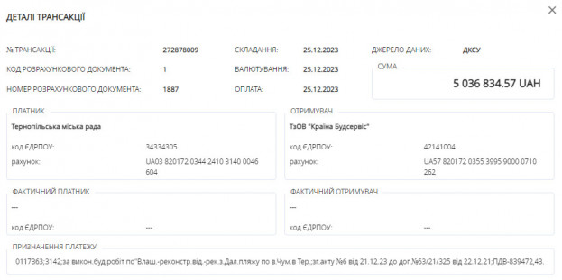 Гроші у сумі 5 млн. 036 тис. 834,57 грн. перераховані ТзОВ “Країна Будсервіс”.