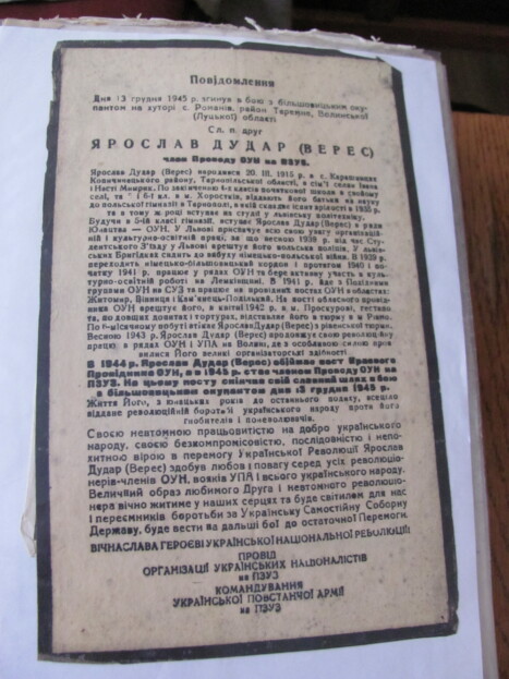 Заступник директора музею показав нашим журналістам кілька видань «Вістей з терену» із шифром Тернопільщини, журнал «Інформатор», суспільно-політичний звіт Кременецького району, інструкцію для пропагандистів, як робити друкарські відтиски, чимало листівок. На одній із них є повідомлення про смерть уродженця села Карашинці (нині – Гусятинський район) Ярослава Дудара (псевдо «Верес»), котрий був членом проводу ОУН на Волині. Він загинув у грудні 1945 року в бою з більшовиками на хуторі с. Романів (Волинська область). Подібні листівки, за словами науковця, поширювались у підпіллі та передусім інформували членство ОУН про видатних людей.