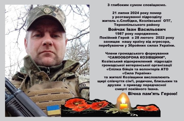 – На жаль, війна забрала від нас ще одного захисника і мужнього воїна, жителя с. Слобідка Івана Васильовича Войчака. Раптово перестало битися серце. Покійний Герой з 28 лютого 2022 р. захищав нашу країну від агресора. Смерть Героя – непоправна втрата для нашої громади та України. Козлівська громада висловлює співчуття, спільно розділяючи біль втрати, з рідними та близькими захисника, – йдеться в повідомленні голови Козлівської громади Володимира Колісника.