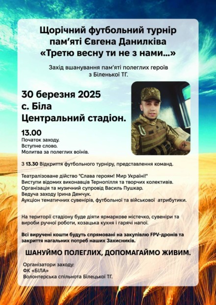 30 березня у селі Біла, що біля Тернополя на сільському стадіоні відбудеться щорічний футбольний турнір пам’яті Євгена Данилківа «Третю весну ти не з нами…» Захід приурочений до вшанування пам’яті полеглих героїв з Біленької ТГ.