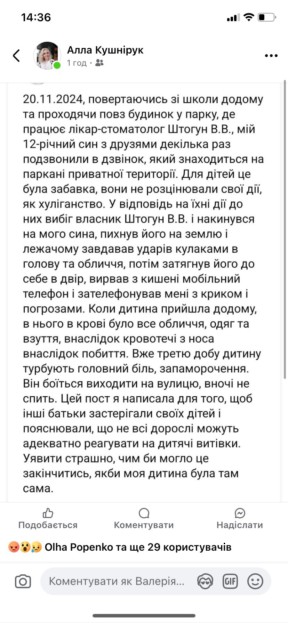 «Внаслідок побиття хлопчик отримав кровотечу з носа, садна та психологічну травму. Наразі дитина скаржиться на головний біль і боїться виходити на вулицю», – повідомомила журналістам сайту Місто мама потерпілого хлопчика.