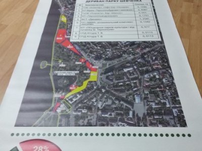 Детективи, серед іншого, вилучили документи, які стосуються зміни меж парку імені Тараса Шевченка, що в центрі Тернополя. Правоохоронців, зокрема, зацікавило, яким чином за останні дві каденції міського голови Тернополя, «свободівця» Сергія Надала, площа парку зменшилася з майже 22 гектарів до 16-ти.