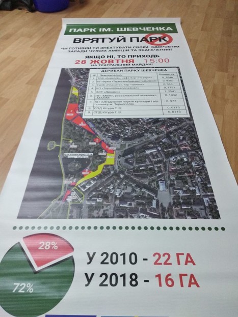 Нагадаємо, свого часу місцева громадська активістка Юлія Мамчак озвучила цифру, за якою загальна площа усіх парків Тернополя за період керування містом Сергієм Надалом зменшились на 167,2 га. Це відбулося у зв’язку із тим, що Тернопільською міською радою ухвалювались рішення, згідно з якими паркові зони передавалися для здійснення комерційної діяльності та будівництва житлових будинків.