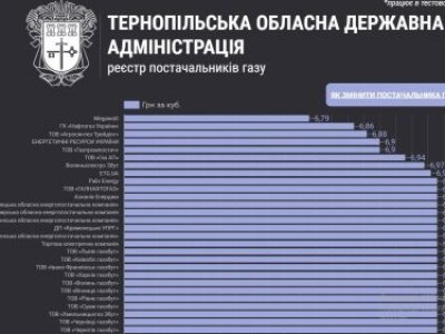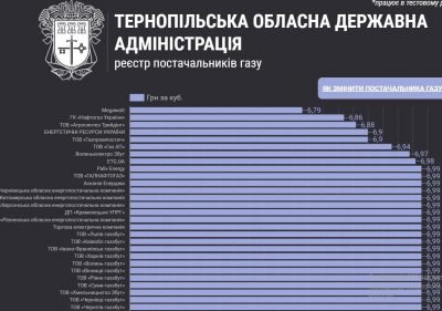 У Тернопільській обласній державній адміністрації розробили реєстр постачальників газу. В ньому є інформація про компанії, що торгують блакитним паливом, та вартість їхніх послуг. Таким чином, жителі Тернопільщини зможуть стежити за цінами на газ та обирати для себе вигідну пропозицію. Навіть попри граничну ціну 6,99 грн за кубометр одразу 8 компаній оприлюднили кращі пропозиції на лютий: від 6,79 до 6,98 грн/ за кубометр.
