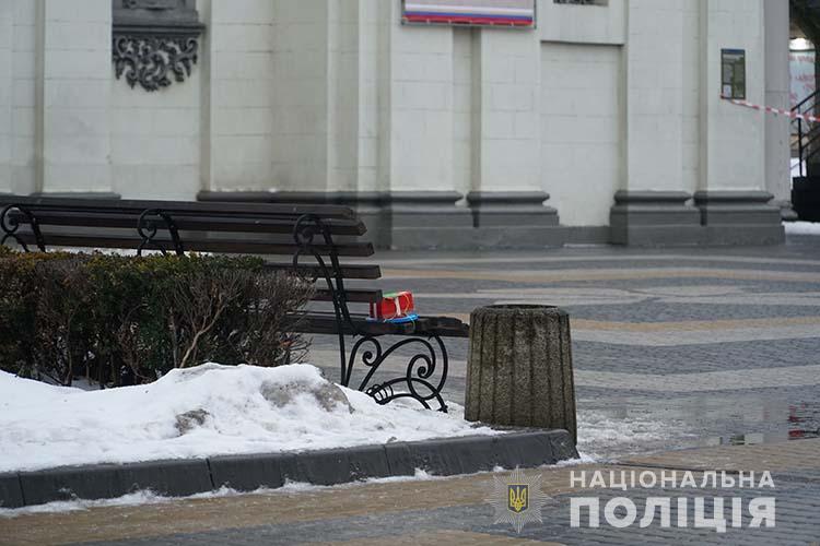Коробка знаходилася на лавці біля катедрального собору у Тернополі. Вона нагадувала новорічний подарунок.
