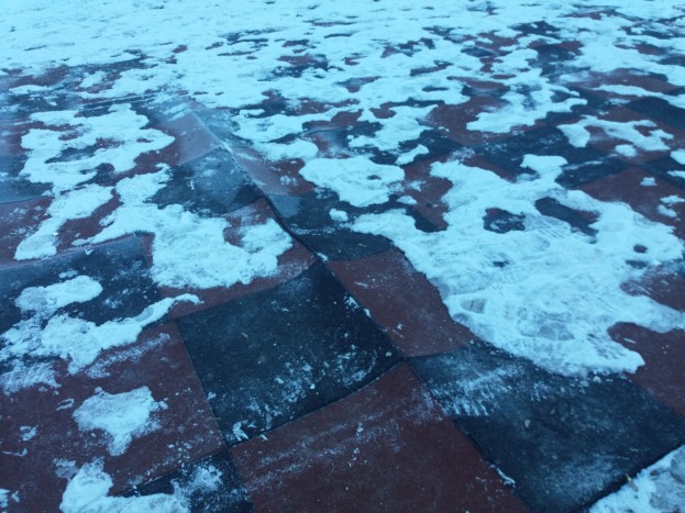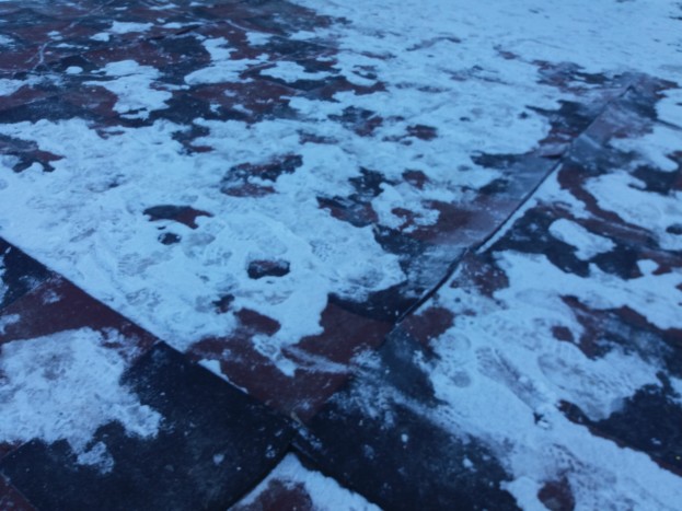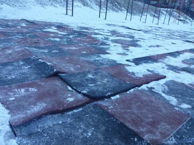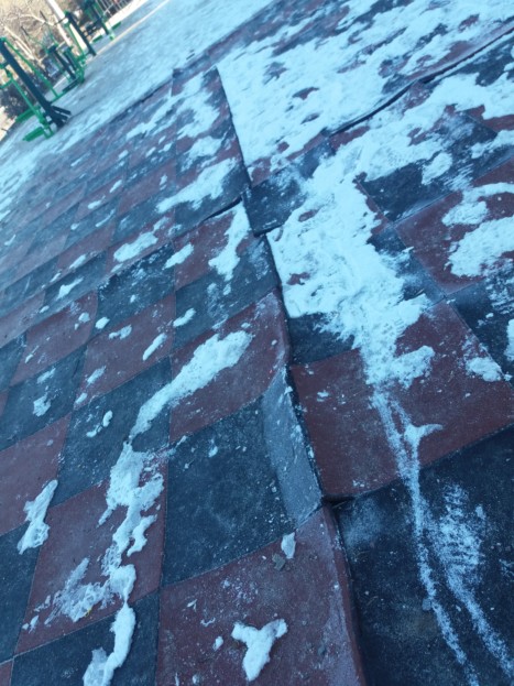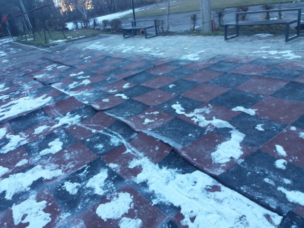 Чи то підрядник неясне «спеціальне» покриття встановив, чи зекономив на розхідних матеріалах, але факт залишається фактом, «шашечка» з якого зроблений настил почала розходитися, скручуватися і незабаром того й дивись зовсім повідлітає. Про це красномовно засвідчують представлені фотографії. Хоча, вже зараз можна спрогнозувати відповідь, що у всьому винні… морози, яких як таких цієї зими й не було…