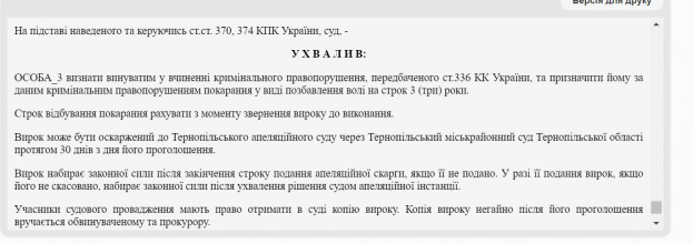 Суд визнав чоловіка винним за статтею 336 ККУ та засудив до 3 років позбавлення волі.