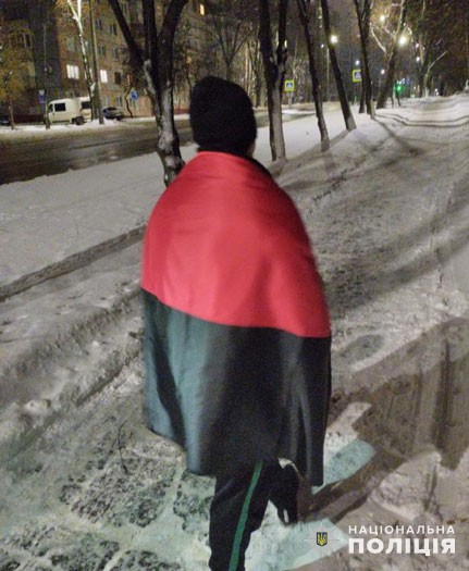 13 січня близько 21 години до співробітників Тернопільського районного управління поліції надійшло повідомлення від місцевої жительки про те, що на зупинці громадського транспорту, що на вулиці Тарнавського, перебуває невідомий чоловік з червоно-чорним прапором і тягне його по землі.