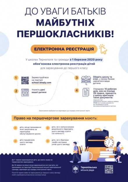– Така система вже працює у чотирьох містах. Цього року ми впроваджуємо її і для реєстрації дітей у перші класи. Програма буде працювати у тестовому режимі. Вона дає можливість стати на чергу одразу у три навчальні заклади, а також можна вказати, яка школа для дитини є у пріоритеті, – розповідає головна інспекторка з позашкільної роботи Тернопільської міської ради Ольга Заблоцька.
