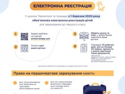 Записати дитину в тернопільську школу буде легко та просто за допомогою новітньої програми «Електронна черга». З 1-го березня по 29-те травня батьки зможуть подати заявку онлайн. У міській раді переконують, що така система дозволить без черг та зайвих зусиль записати дитину в будь-який шкільний заклад, а також гурток, секцію чи мистецьку школу.