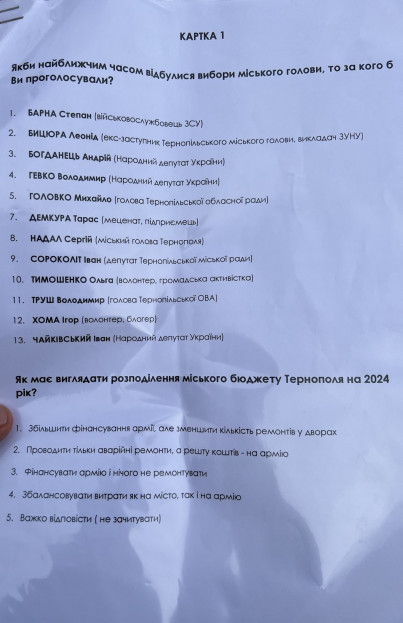 Нам вдалося потай сфотографувати декілька запитань із переліку, який використовує Smartpoll для опитування в Тернополі. З них можна одразу здогадатися, кому воно вигідне і для якої мети.
