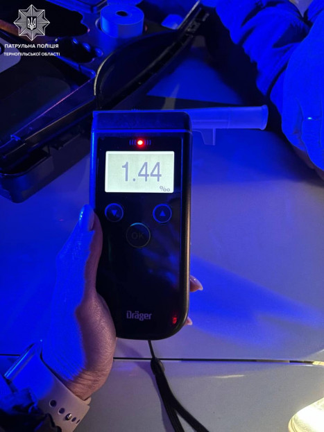 Спілкуючись з керманичем, патрульні помітили в нього ознаки алкогольного сп’яніння. Водій погодився пройти огляд на визначення стану сп’яніння за допомогою приладу Драгер на місці. Результат — 1,44 проміле алкоголю в крові кермувальника, що перевищує допустиму норму.