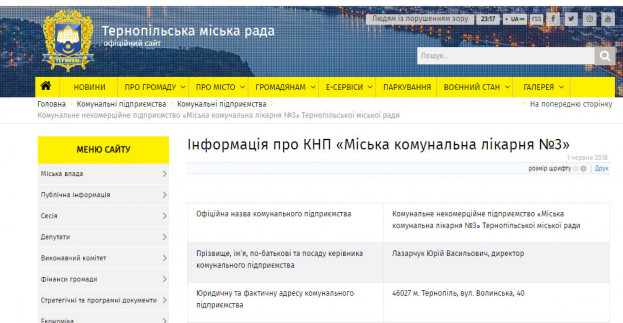 Хоча декларація датується ще 29 лютим ц.р., на сайті Тернопільської міської ради Юрій Васильович Лазарчук і далі продовжує значитися директором лікарні №3 (див. скрін).