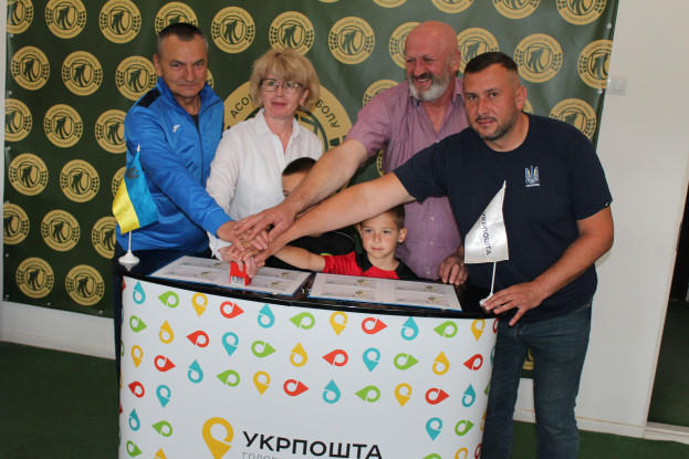 Виконати почесне перше спеціальне погашення поштової марки «Україно, вперед!» спеціальним поштовим штемпелем «Україно, вперед!». Тернопіль. 46001. 13.06.2024.» Тарас Юрик, Тамара Оксюта, Олег Любінський, Роман Мацюпа та юні футболісти.