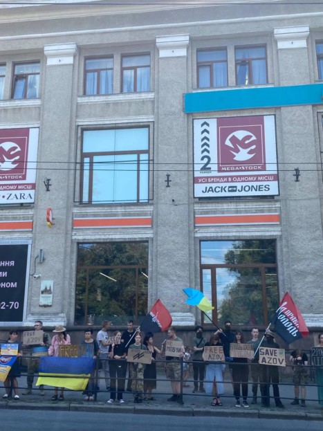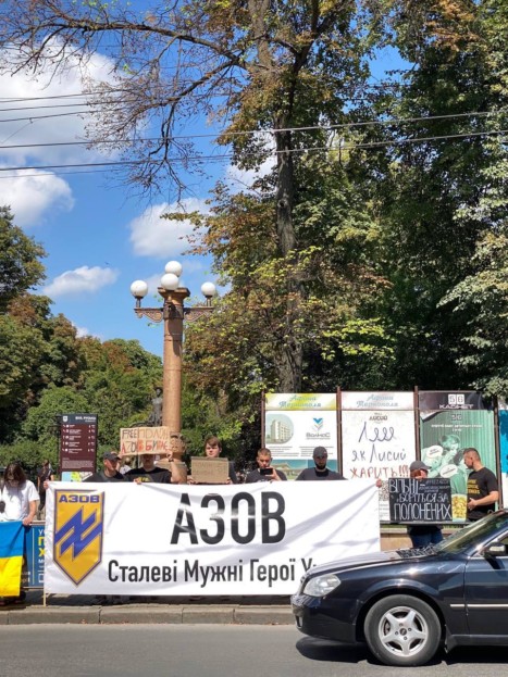 Учасники акції тримали в руках плакати з написами “AZOV сталеві мужні Герої України”, “Поверніть Героїв з полону”, “Волю Азову”, “Мовчання вбиває”.