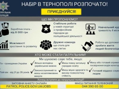 12 червня у Тернополі стартував набір до лав патрульної поліції. Зокрема, у Тернополі відкрито 116 вакансій на посади інспекторів.
