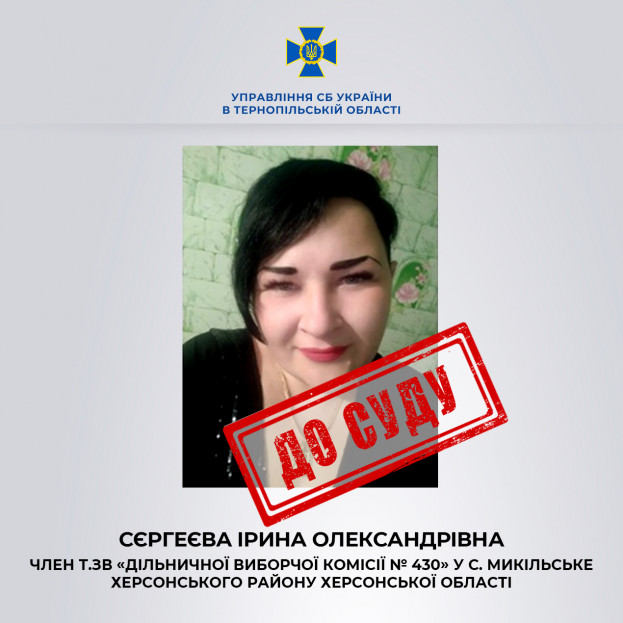 Слідчі Тернопільського управління СБУ направили до суду обвинувальний акт щодо 41-річної жительки с. Микільське Херсонського району, яка добровільно пристала на пропозицію російських загарбників стати членом так званої «дільничної виборчої комісії».