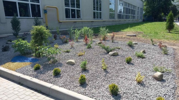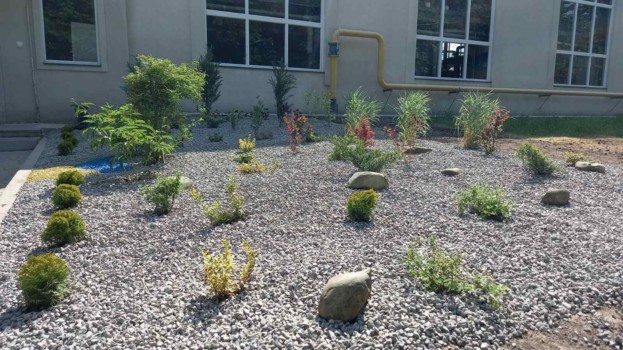 Мінімалістична композиція, виконана із декоративних рослин із застосуванням камінців, розташована поблизу котельні на вулиці Лесі Українки, 4.