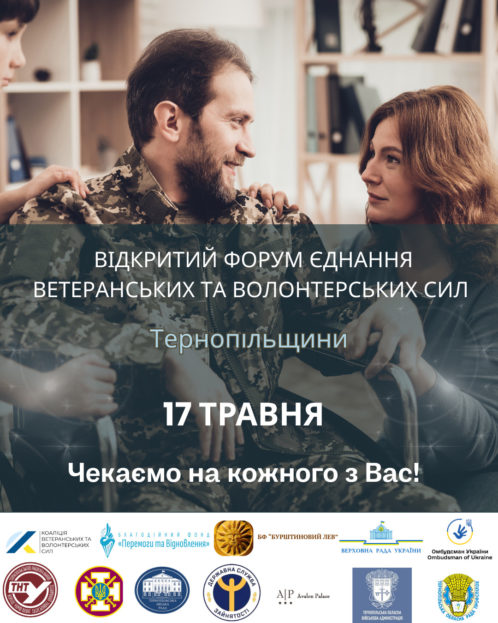 17 травня 0 10-00 у Тернополі розпочне свою роботу Відкритий Форум Єднання Ветеранських та Волонтерських Сил Тернопільщини — це платформа для конструктивного діалогу між ветеранами, волонтерами, громадськими організаціями, державними установами, бізнесом та освітніми закладами.