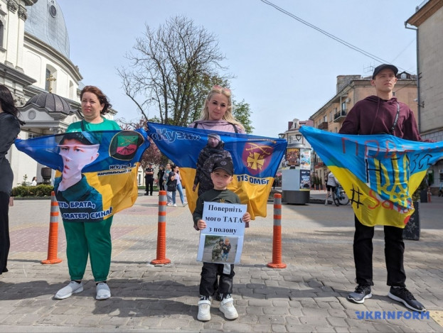 Чоловік Ірини Кушнір чотири місяці тому потрапив у полон на Харківщині. Жінка прийшла на акцію із трирічним сином Андрієм. На плакаті у хлопчика напис «Поверніть мого тата додому».