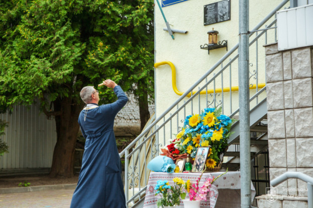 Відкрили та освятили меморіальну таблицю спільно міський голова Сергій Надал з духовенством, колегами-працівниками, родичами та друзями захисника.