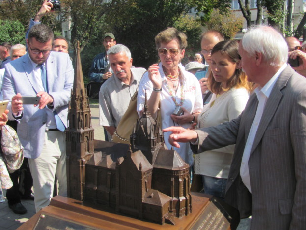– Щоденно над будівництвом костелу працювало 30 мулярів, 15 каменярів, 6 теслярів, 50 помічників та 25 дівчат, – розповідає автор ідеї встановлення макета Тарас Циклиняк. – Завдяки цій праці було створено споруду висотою 69 метрів. З її вежі було видно околиці на відстані 30 км. Внаслідок Першої та Другої світових воєн храм було знищено. Він перетворився на руїну, а в 1959 році на його місці звели центральний універмаг.