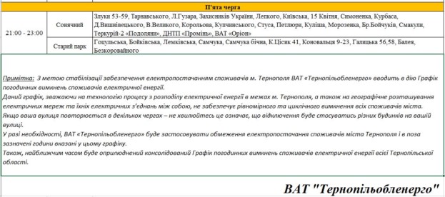 У разі необхідності, ВАТ «Тернопільобленерго» буде застосовувати обмеження електропостачання споживачів м. Тернополя і в поза зазначені години, вказані у цьому графіку.
