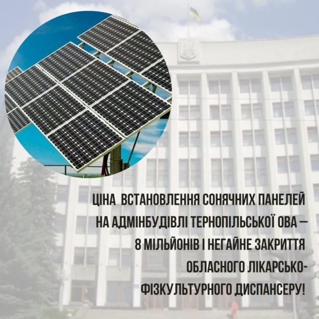 У Тернопільській обласній військовій адміністрації вирішили виробляти власну електроенергію, інвестувавши 8 мільйонів гривень у встановлення сонячних панелей на адмінбудівлі по вул. Грушевського, 8. Цей проєкт фінансуватиметься в межах Програми енергонезалежності та енергоефективності на 2025-2027 роки, затвердженої 13 грудня 2024 року. Пише депутат обласної ради, свободівець Олег Сиротюк.