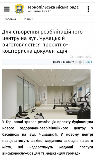 Нагадаємо, у червні 2023 року влада Тернополя повідомляла, що у місті триває реалізація проєкту будівництва нового оздоровчо-реабілітаційного центру з басейном на вул. Чумацькій. У новому центрі, за обіцянками мерії, мали б працювати фахівці медичних закладів міста, які надавали б медичні послуги військовослужбовцям та мешканцям громади. На той час влада заявляла, що розробляється проєктно-кошторисна документація з облаштування повноцінного центру реабілітації у новозбудованому приміщенні площею понад 1100 кв. м. Тоді міська рада працювала над пошуком інвесторів та залученням грантових коштів для облаштування даного центру. Проєктом передбачено капітальний ремонт наявних приміщень під амбулаторний оздоровчо-реабілітаційний центр з реабілітаційним басейном, залами фізичної терапії, кабінетом ерготерапії, кабінетами психологів та психотерапевтів, кабінетом арттерапії та палатами денного перебування.