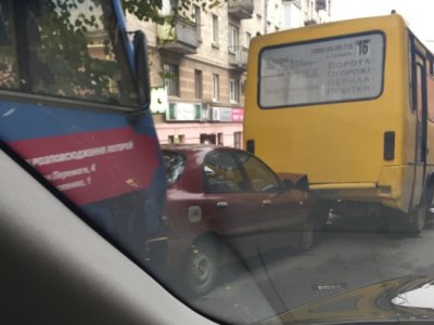 Дві маршрутки затиснути легковий автомобіль. Очевидно, водії не обрали безпечну дистанцію: водій першої маршрутки загальмував, а транспортні засоби, які рухалися позаду, не встигли відреагувати на маневр.
