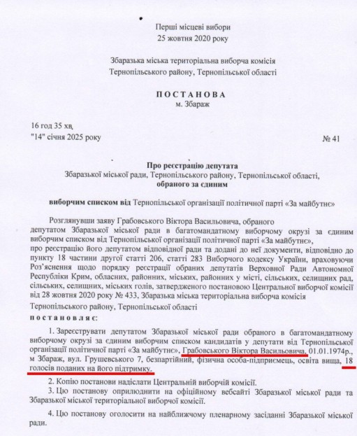 У Збаразькій міській раді буде новий депутат – Грабовський Віктор Васильович. За нього віддали голоси всього 18 мешканців.