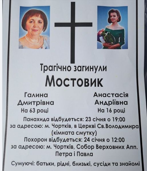 – 22 січня у ДТП трагічно загинула учениця 10 класу Анастасія Мостовик. Талановита, творча, всесторонньо розвинена особистість, котра відійшла від нас у час своєї квітучої юності… Вона стала прекрасним янголом, котрий споглядатиме на нас з небес. Висловлюємо глибокі співчуття батькам та рідним Насті з приводу непоправної втрати. Невимовний біль огортає серце… Спи спокійно, дорога Настусе. , – йдеться в повідомленні Чортківської гімназії імені Маркіяна Шашкевича.
