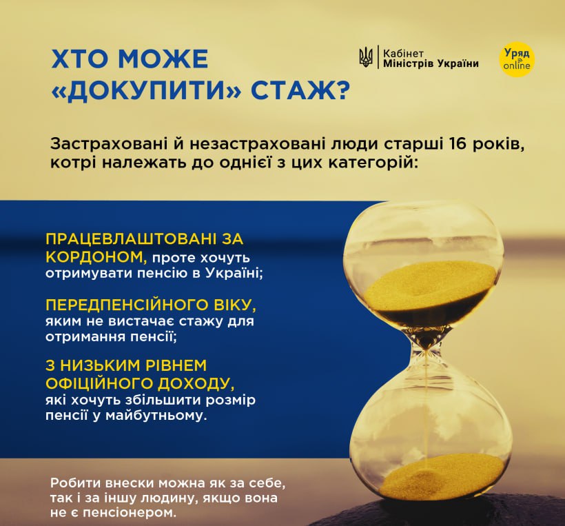 Українці можуть «купити» страховий стаж для виходу на пенсію у 60 років або для отримання вищої пенсії. Про це йдеться на Урядовому порталі.