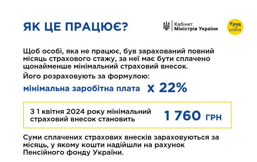 Щоб особі, яка не працює, був зарахований повний місяць страхового стажу, за неї має бути сплачено щонайменше мінімальний страховий внесок. Його розраховують за формулою: мінімальна заробітна плата х 22%. З 1 квітня 2024 року мінімальний страховий внесок становить 1760 грн.