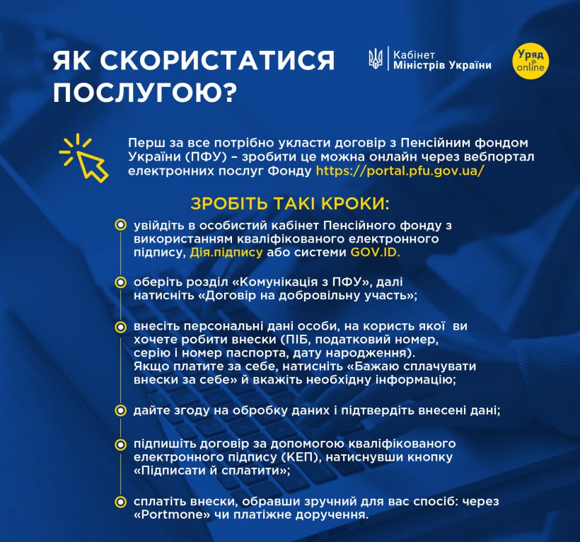 Перш за все потрібно укласти договір з Пенсійним фондом України (ПФУ) – зробити це можна онлайн через веб-портал електронних послуг фонду. Потім потрібно зробити наступні кроки: