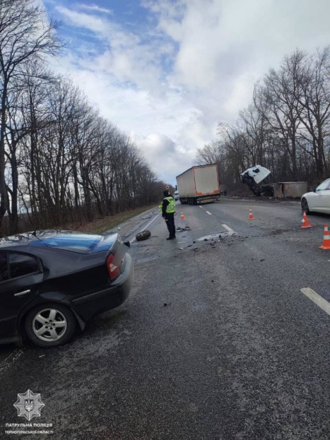 Повiдомляється, що на мiсцi подiї працюють усi вiдповiднi служби. Патрульнi здiйснюють рeгулювання дорожнього руху. За iнформацiєю очeвидцiв, сильно пошкоджeно лeгковий автомобiль. Водiй вантажiвки, яка злeтiла у к’ювeт, травмований.