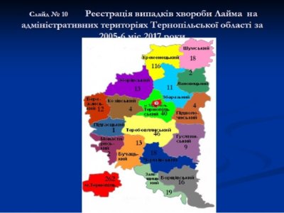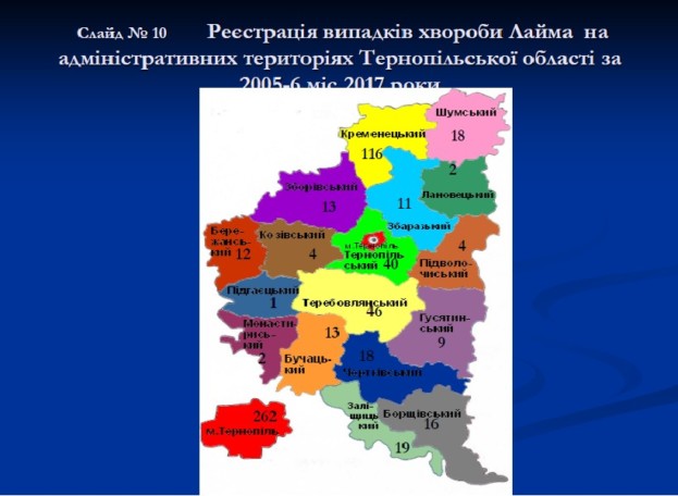 Випадки хвороби Лайма реєструються на всіх територіях Тернопільської області. На деяких із них показники уже низькі. Але це говорить не про благополуччя регіону, а про вади реєстрації. У більшості випадків люди не звертаються за медичною допомогою.