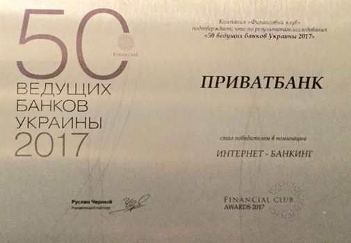 За підсумками FINANCIAL CLUB AWARDS – 2017, ПриватБанк увійшов до топ-5 провідних банків України. А заступника голови правління ПриватБанку Олександра Дубровіна було визнано одним з найкращих фінансових директорів українських банків.