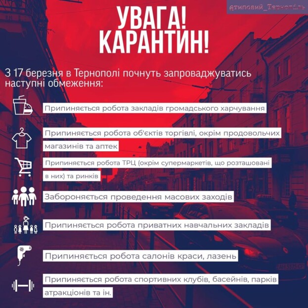 Тим часом на позачерговій сесії Тернопільської міської ради, яка відбулася 17 березня, вирішили з метою недопущення занесення і поширення на території Тернопільської міської ОТГ випадків захворювання, причиною яких може стати коронавірус, вжити карантинних заходів. Таким чином із 17 березня у Тернополі і селах громади забороняється проведення всіх масових заходів, у яких бере участь понад 10 осіб, крім заходів, необхідних для забезпечення роботи органів державної влади та органів місцевого самоврядування. Припиняється робота всіх ринків із торгівлі промисловими товарами та автозапчастинами на території Тернопільської міської територіальної громади. Вводяться обмеження на торгівлю харчовими продуктами на ринках, при цьому створюються умови для безперебійної торгівлі продуктами першої необхідності, ліквідовується стихійна торгівля. Забороняється ввезення на територію ТМТГ продуктів із Чернівецької та Житомирської областей, враховуючи введення там надзвичайної ситуації, пов’язаної з COVID-19. На території ринків з реалізації харчових продуктів забороняється продаж товарів промислової групи, окрім засобів гігієни, миючих та дезінфікуючих засобів. Реалізація всіх харчових товарів (за винятком м’яса та риби) буде здійснюватись у фасованому та упакованому вигляді. На ринках (центральному і на вул. Шептицького) з реалізації харчових продуктів зменшиться кількість торгових місць, забезпечивши інтервал між ними 2 метри. Забороняється робота торгово-розважальних центрів (окрім супермаркетів, що знаходяться на їх території), кінотеатрів, театрів, музеїв, бібліотек та інших розважальних закладів, дитячих розважальних центрів та клубів, майданчиків, у тому числі спортивних, навчання у приватних центрах раннього  розвитку дітей, приватних дошкільних навчальних закладах, спортивних клубах та танцювальних колективах, фітнес-клубах, тренажерних залах, басейнах, спортивних майданчиках та стадіонах, водному парку, парках атракціонів.