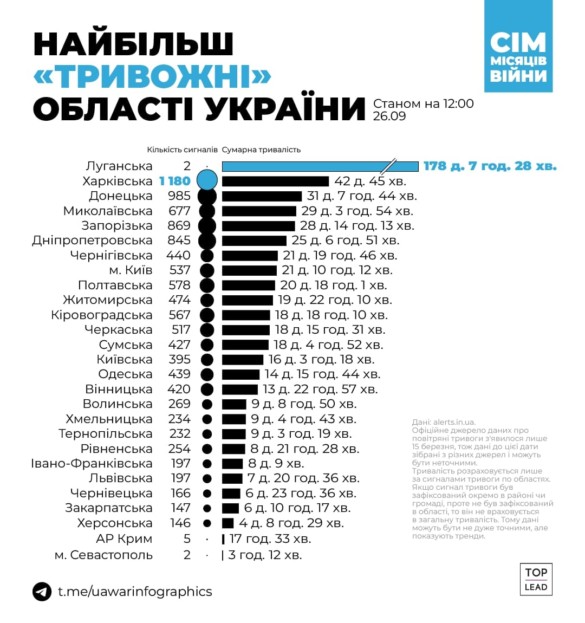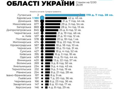 Найчастіше повітряну тривогу оголошували в Харківській області – 350 разів. Загалом вона тривала майже 12 діб. Серед лідерів за сумарною тривалістю знаходяться Чернігівська, Житомирська, Харківська, Запорізька області та місто Київ. Найменше тривога тривала на Херсонщині – 4 години 40 хвилин.