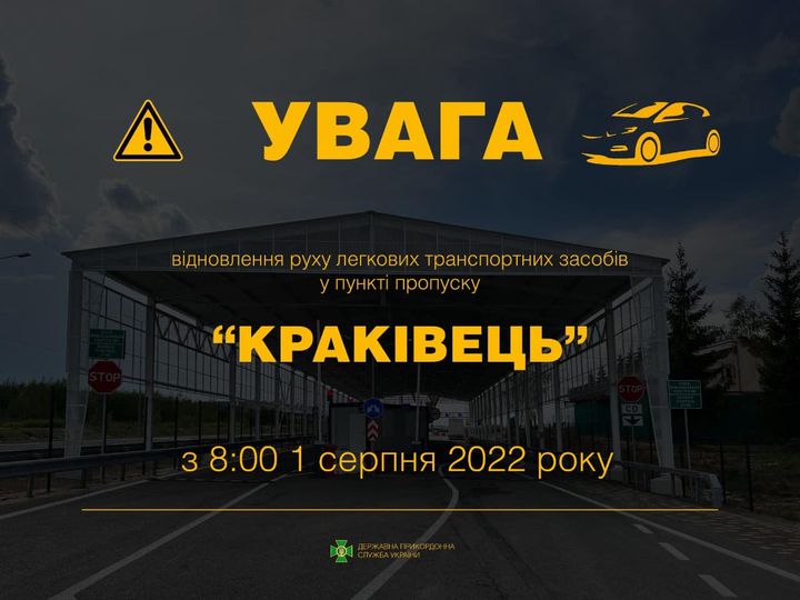 З 8 годині 1 серпня 2022 року через пункт пропуску «Краківець», що на Львівщині, буде відновлено пропуск легкових автомобілів. Про це повідомляє Державної прикордонної служби України.