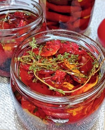 Спочатку сушила в духовці при температурі 100 – 110 градусів години півтори, потім при 70 градусах 2 – 3 години (у процесі сушки постійно провіряємо на наявність уже висушених кусочків, щоби не пересушити), а далі досушуємо вже на більш низькій температурі. Готові в’ялені помідори виймаємо з духовки даємо повністю охолонути. У сухі стерильні банки викладаємо в’ялені помідори додаємо декілька слайсів сирого часнику та по гілочці сухого чабрецю, заливаємо оливковою олією, закручуємо кришку. Зберігаємо у холодильнику 6 – 8 місяців.
