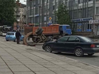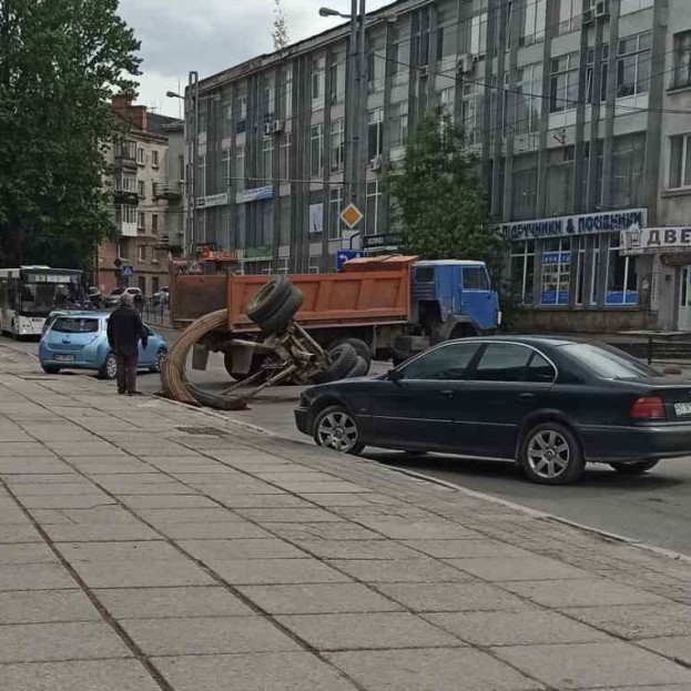 У ці хвилини рух однією з головних вулиць Тернополя – Крушельницькою – заблоковано. Прямо перед головною адміністративною будівлю області – «білим» домом, у вантажівки КАМАЗ, яка перевозила арматуру, вивернуло причіп, який утримував металеві прути.